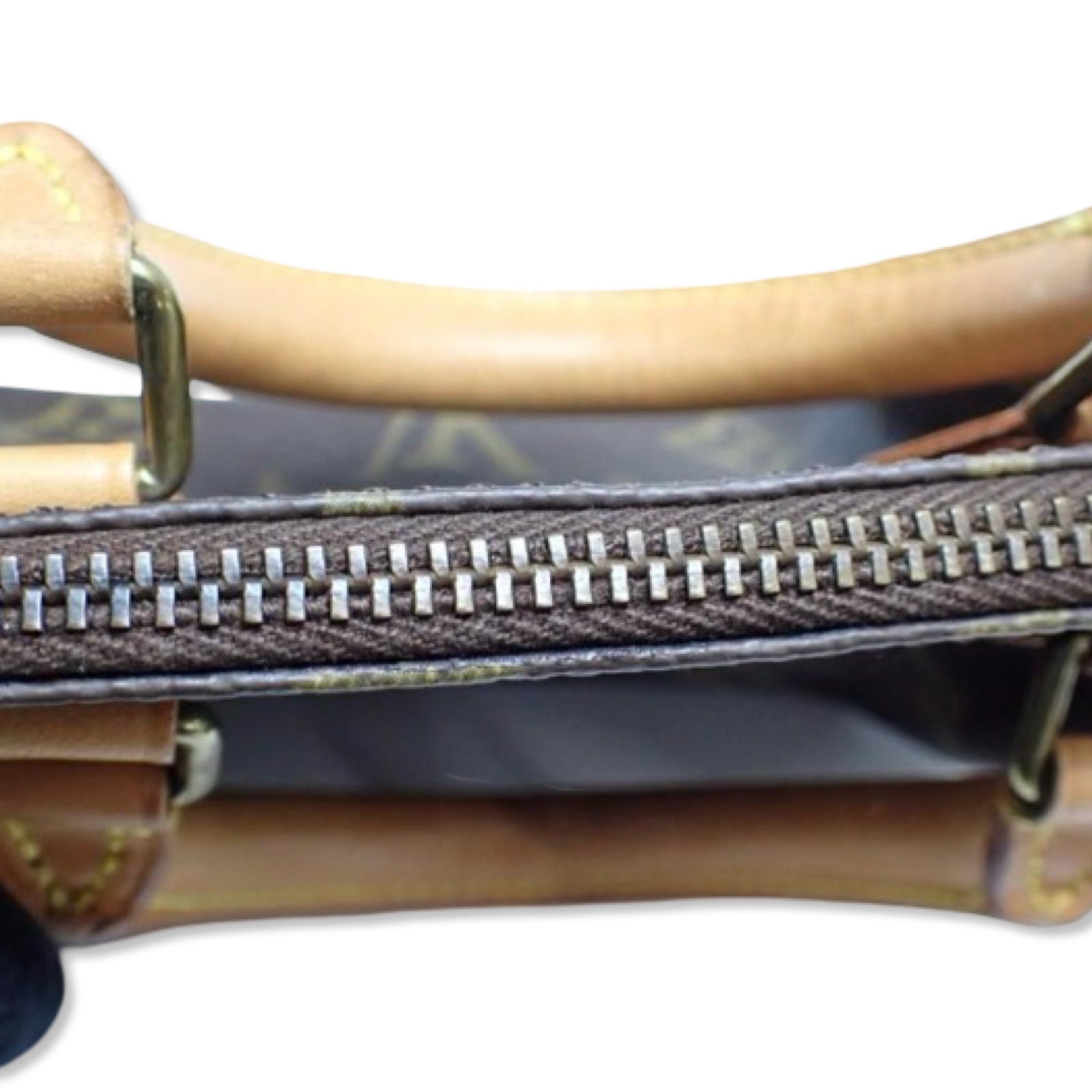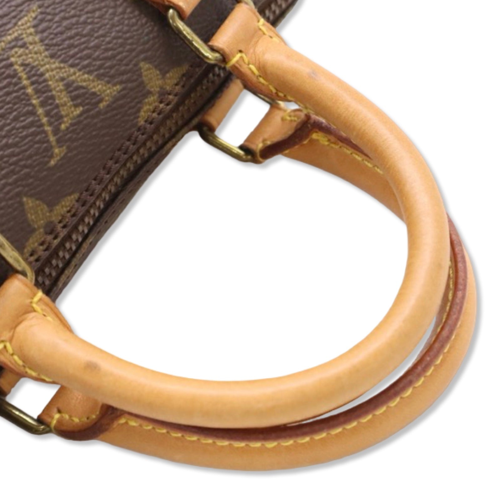 Monogram canvas is bright. Handles have an even patina. Hardware has tarnishing, but is consistent on all hardware. Interior is clean.